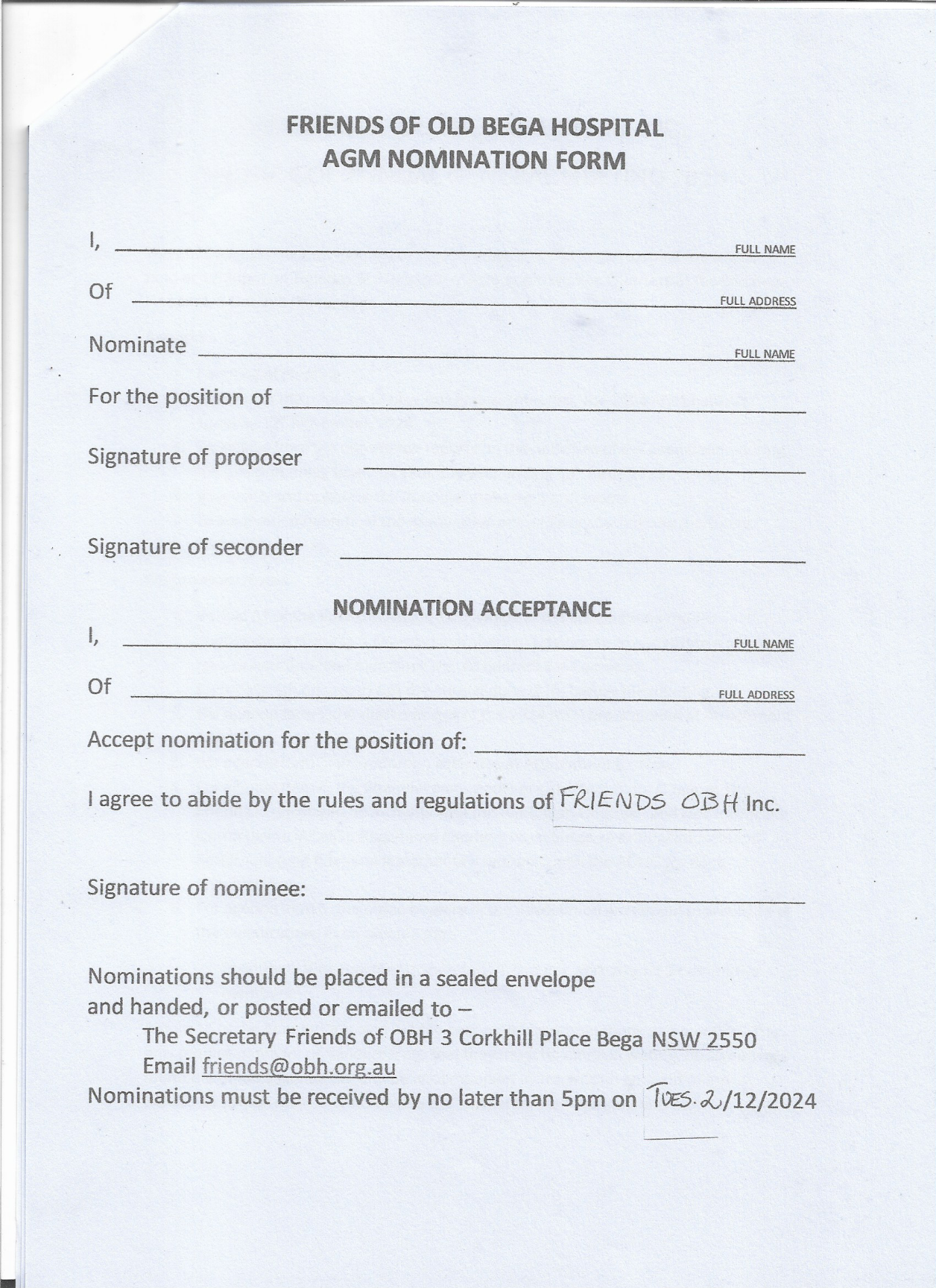 The 2025 Annual General Meeting of the Friends of the Old Bega Hospital Inc will be held at 12.30pm on Tuesday 9 December, 2025 at the Women’s Ward in the main building at the Old Bega Hospital, 3 Corkhill Place, Bega.
