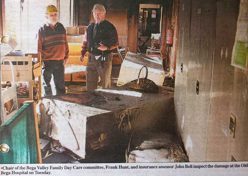The building, built in 1888, had been used by various community groups after it was restored as a Bicentennial project in the late 1980s. The only group with insurance, Bega Valley Family Day Care, had its assessor, Mr John Bell, tour the room to check the damage.