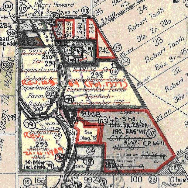 Below: An older plan, reflecting arrangements in the second half of the 1950s, with the 1989 changes annotated by hand. The Old Hospital site is lot 296 in this one too.