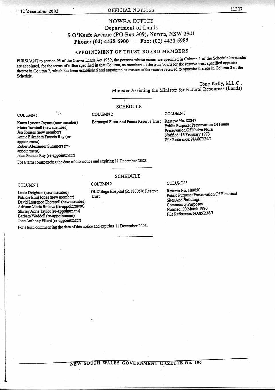 The Old Bega Hospital Commitee was appointed Trustee from 30 March 1990 to 2 June 1994. The membership of the Committee during that period is not known. Since then, individual members have been appointed to the Old Bega Hospital (R.180050) Reserve Trust and its successor, the Old Bega Hospital Reserve Land Manager.